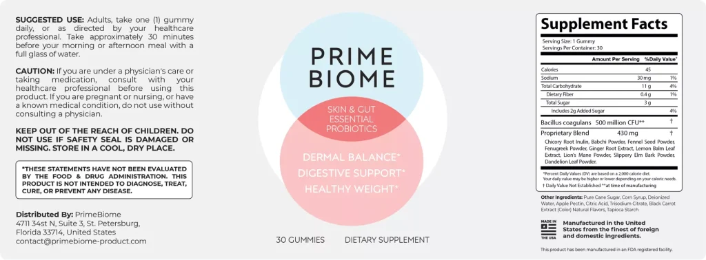 - Content: Each bottle of PrimeBiome contains enough gummies for 30 days of use.